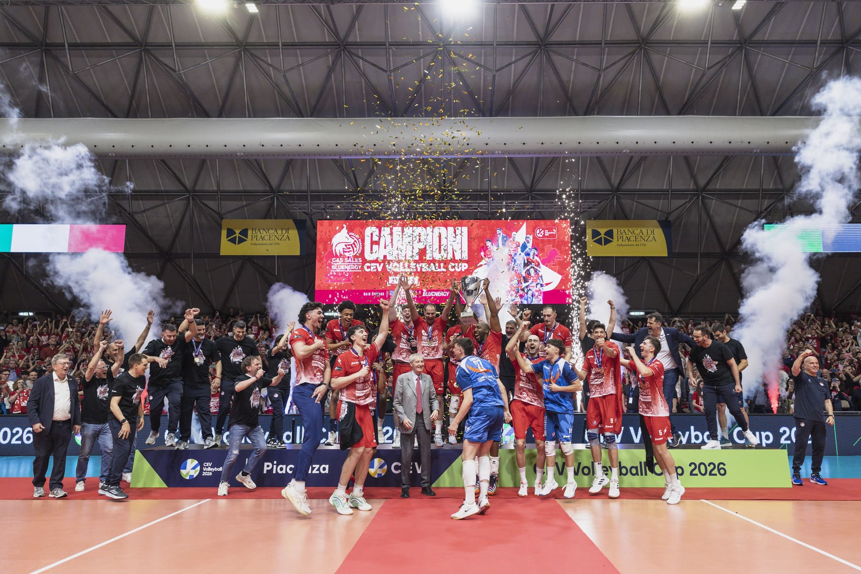 Alla fine del secondo set, quando la vittoria è stata certa, il Direttore Generale di Gas Sales Bluenergy Volley Piacenza Hristo Zlatanov, è corso sugli spalti ad abbracciare la Presidente Elisabetta Curti, che mette in bacheca il suo primo titolo internazionale e commenta: «Una serata indimenticabile: la squadra ha sempre reagito quando ce n’era bisogno e non ha mai mollato, veramente mai».